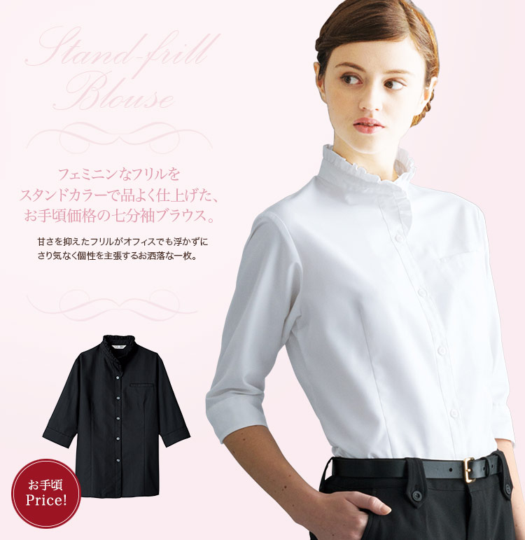 【在庫限り】[通年]高級感あるカルゼ生地がリッチなスタンドフリル襟ブラウス[七分袖](31-BL8055)