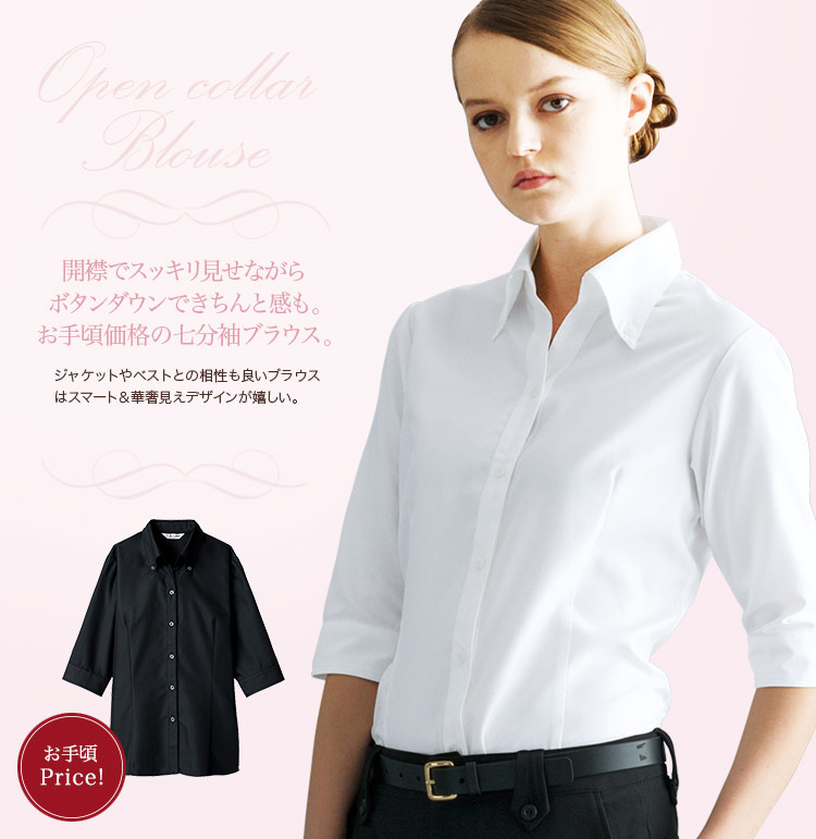 首回りがすっきりとした開襟タイプの七分袖ブラウス。 そこにボタンダウンが施されることで程よい緊張感と信頼感を与えます。 シワになりにくく、毎日のお手入れが簡単なイージーケア素材を使用。 1枚で着ても、帽子やタイ、エプロンなどとコーディネートしても様になります。