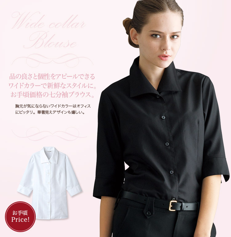 首回りすっきり&こだわりが光るワイドカラータイプの七分袖ブラウス。 シワになりにくく、毎日のお手入れが簡単なイージーケア素材を使用。 1枚で着ても、帽子やタイ、エプロンなどとコーディネートしても様になります。