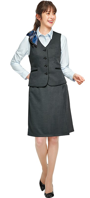 立体的なシルエットが特徴のベスト。切替えにパイピングコードで腰高に見せ、後ろ裾には少しカーブをつけて長くしヒップを小さく見せるなど、スタイルアップ効果抜群!丁寧なディテールで、オフィスワークはもちろん、接客サービスにも合う高級感があります。