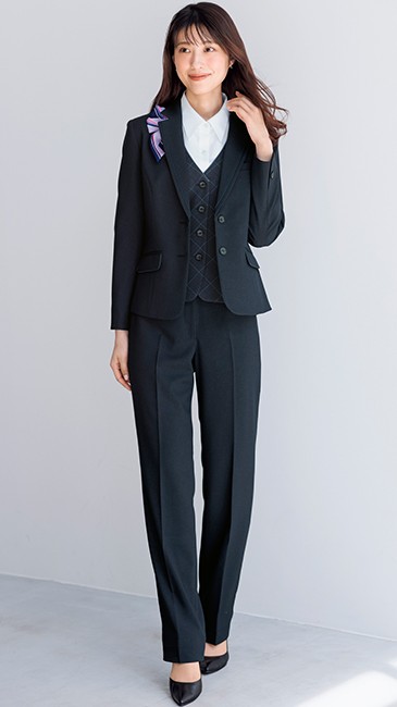 ラペルのカラーパイピングがアクセントになり、襟元をすっきり見せます。