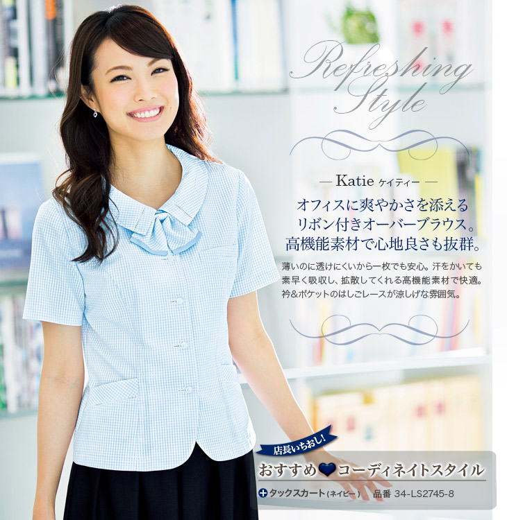【在庫限り】[春夏用]<Katie>リボン付きで爽やか!快適な高機能素材のオーバーブラウス(34-AJ0830)