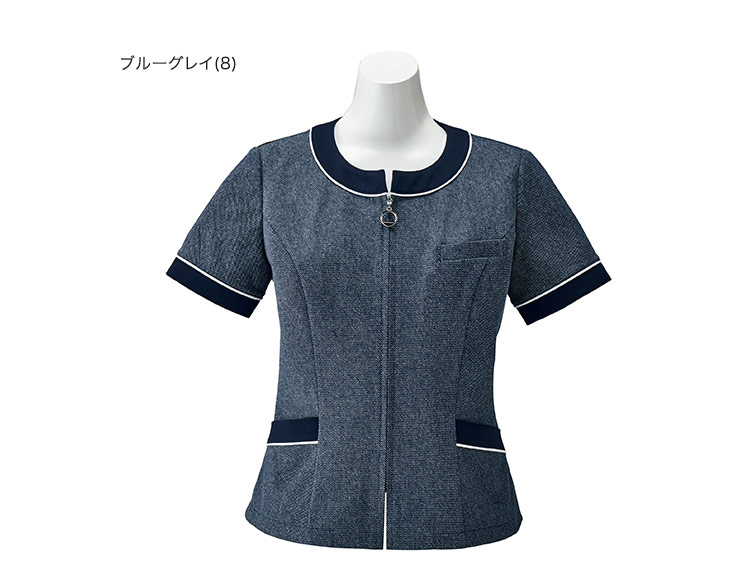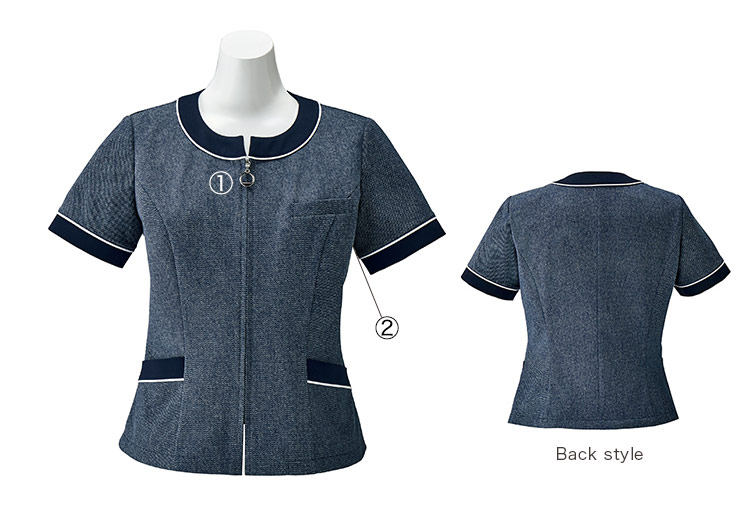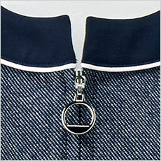 ネイビーに生成りのブークレー糸を編み込んだナチュラルな表情が魅力のデニム調シャンブレーは、取扱いの楽なポリエステルと綿の混紡素材。綿の吸汗性とナチュラルでソフトなタッチも特長。