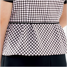 ウエストをパイピングでマークし、腰位置を高く見せます。タックの入ったペプラムが腰まわりをカバーしながら可愛さもプラス。