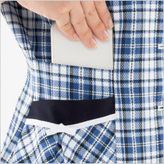 - 左胸箱ポケット、両脇挟み込みポケット、右脇スマホポケット、袖ぐり消臭テープ付き、一重仕立て