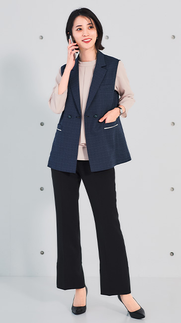 控えめなチェックがかわいいロングベスト。袖のないジャケット感覚で着られて動きやすさと体型カバーを両方叶えてくれます。ソフトな風合いとストレッチ、軽やかな着心地でお仕事をサポート。快適な着心地でも、きちんと感はキープしてくれるので安心です。