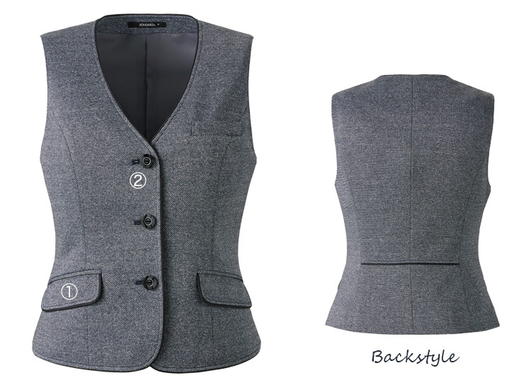 - 左胸箱ポケット(深さ14cm)、両脇フラップポケット(スマホ対応サイズ)、ウエスト位置を高く見せるパイピング