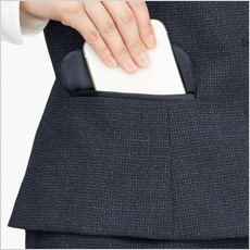 後ろ裾に入ったベンツが腰まわりにゆとりを持たせ、ウエストのパイピングが腰位置を高く見せます。