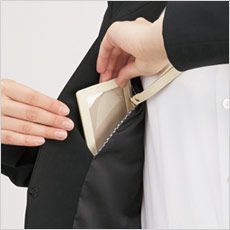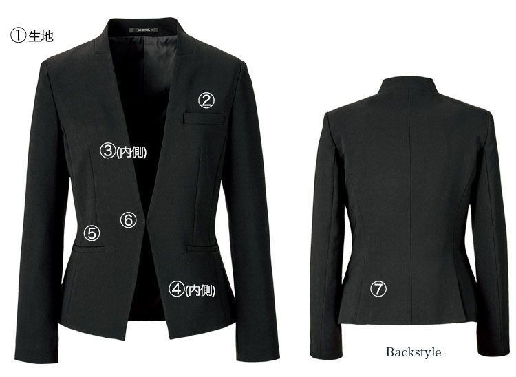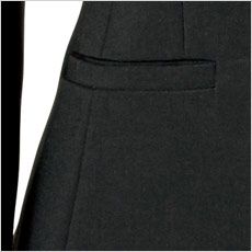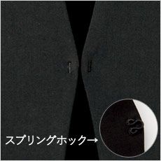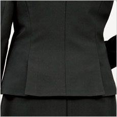 - 前ホック留め、左胸箱ポケット、両脇片玉縁ポケット、左右内ポケット、後ろサイドベンツ