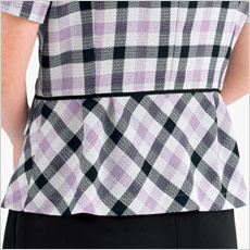 バックのウエスト部分にはトリミングを入れ、腰の位置を高く見せます。ペプラムの可愛いデザインもアクセントです。
