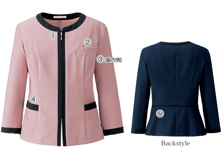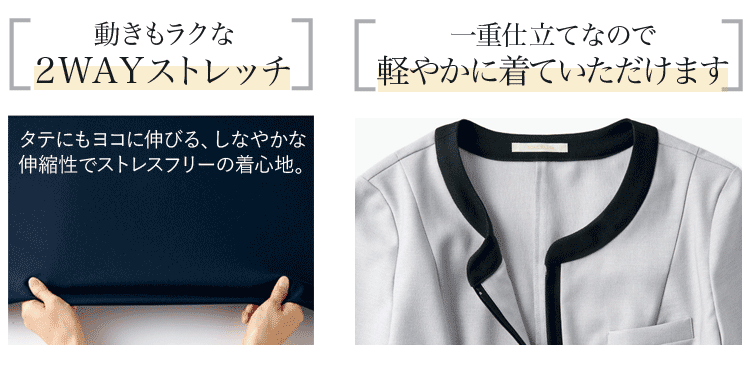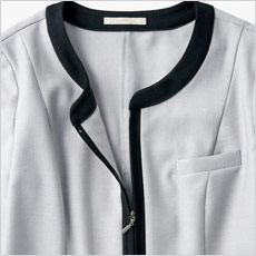 首元をすっきり美しく魅せる、ノーカラーデザインのソフトジャケット。オフィスからおもてなしまで、幅広い業種で着ていただけます。