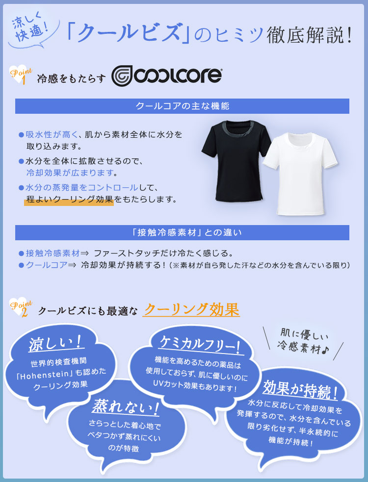 気化熱を利用して冷却する「クールコア」機能は、ファーストタッチだけ冷たく感じる接触冷感素材とは異なり、素材が自ら発した汗などの水分を含んでいる限り、冷却効果が持続する画期的な素材です。