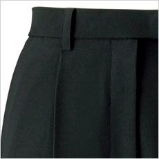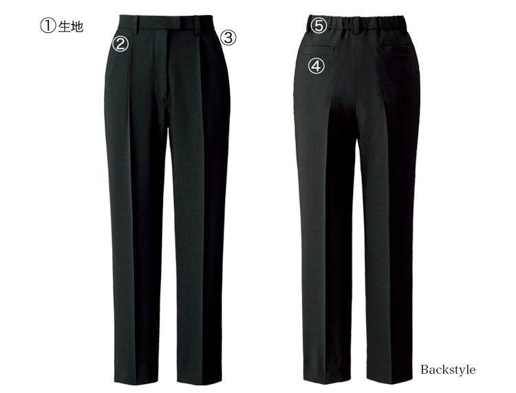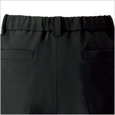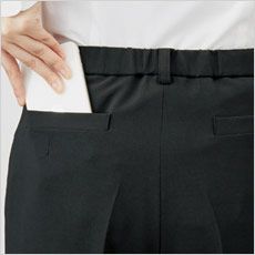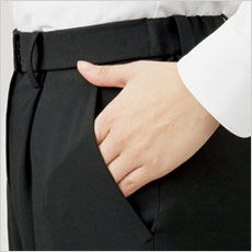 - ジャストウエスト、両脇斜めポケット、両後箱ポケット、前ファスナー開き、ウエスト後ゴム
