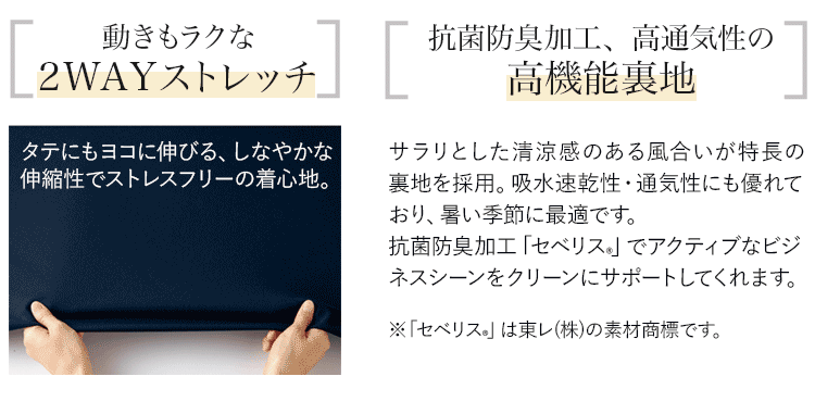 - 2WAYストレッチ、裏地:吸水速乾性、通気性、抗菌防臭加工