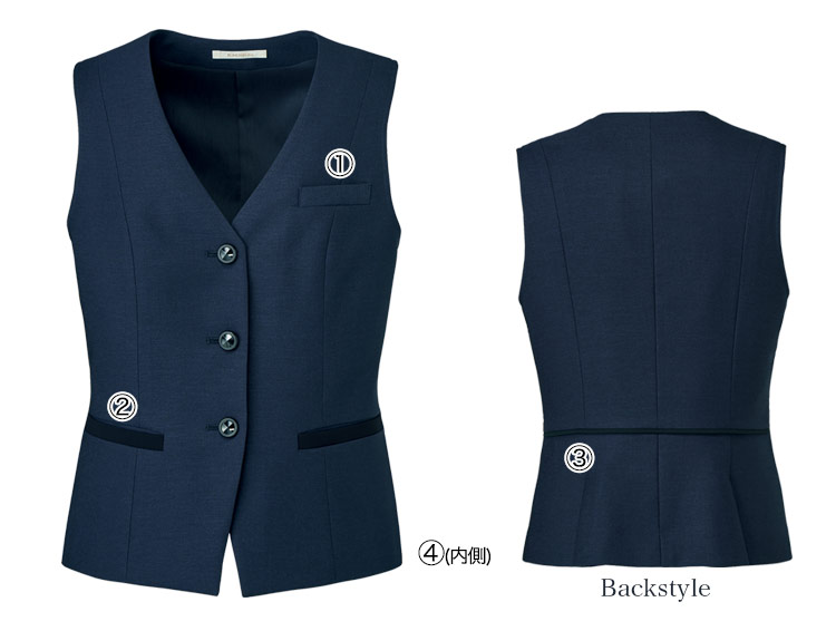 すっきりと美しいシルエットが魅力の上品なベスト。オフィスからおもてなしまで、幅広い業種で着ていただけます。