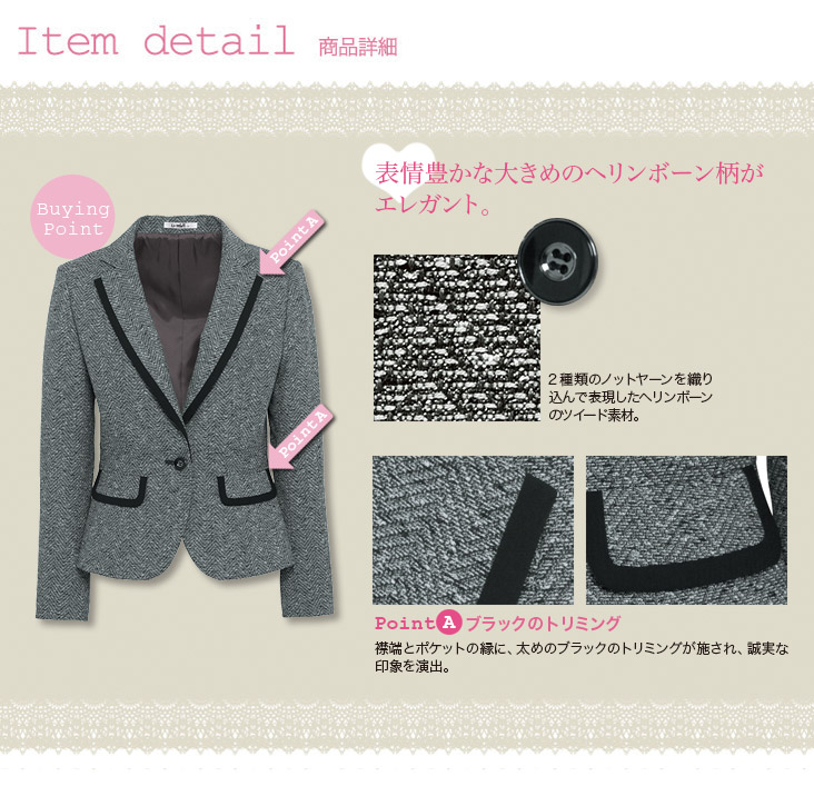 - ノットヤーンヘリンボーン(ポリエステル40%、アクリル25%、毛14%、ナイロン12%、レーヨン8%、ポリウレタン1%)