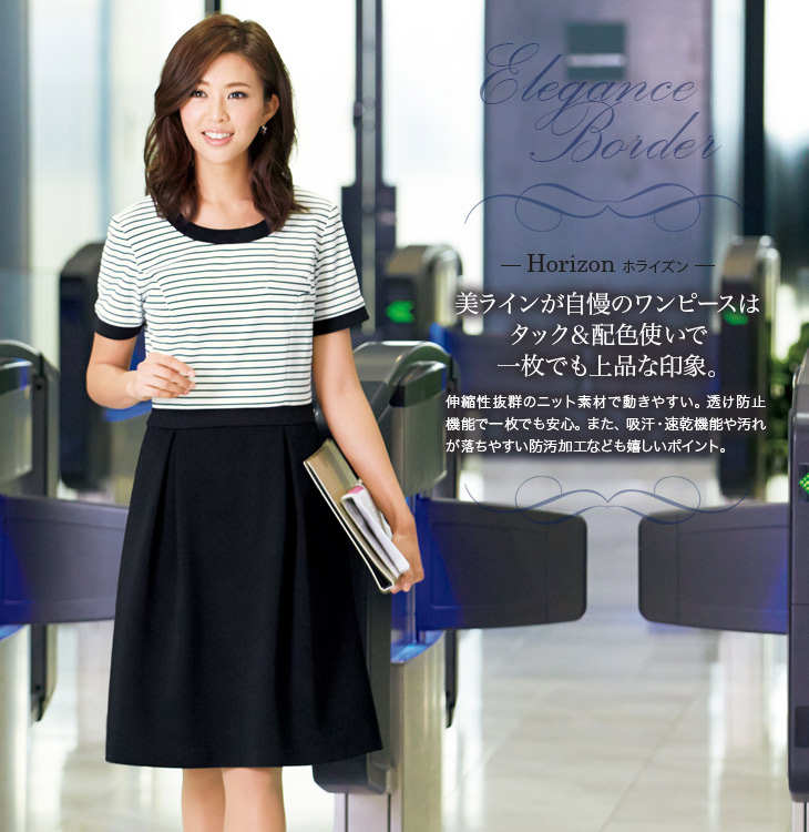 【在庫限り】[春夏用]<Horizon>快適なニット素材。ボーダー×無地のワンピース[半袖](34-LO5708)