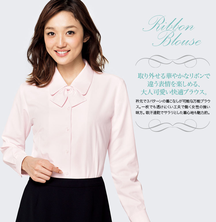 【在庫限り】[通年]華やぎリボンがポイントの透けにくいブラウス[長袖](34-RB4149)
