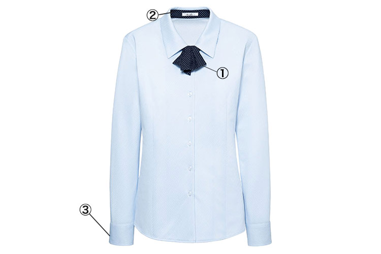 さりげない光沢感が上品なニットの長袖ブラウスは、抗菌防臭・防汚加工・透け防止、更にはUVカットと働く女性が安心できる機能満載!リボンはボタンで取り外し、スタンダードなブラウスとしても着ることが出来ます。