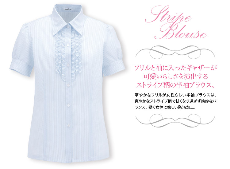 【在庫限り】ボリュームのあるフリルが華やかなストライプ柄ブラウス[半袖](34-RB4529)