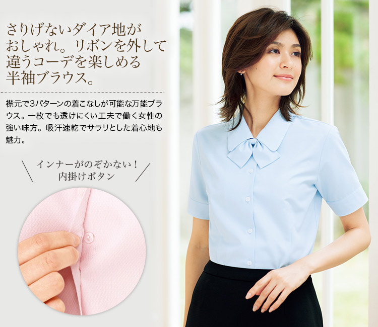 メーカー,ボンマックス,BONMAX,ボンマックス,BONMAX,半袖,シャツ,ブラウス,事務服,無地,オールシーズン,春夏,秋冬,ホワイト,ブルー,ピンク,台衿,かわいい系,カワイイ,エ レガント,ホームクリーニング可,吸汗・速乾,UVカット,UVカット効果,防透性,リボン付き,ファイテン