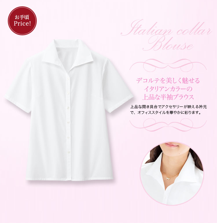 胸元のアクセサリーが映える、上品な開き具合のイタリアンカラー半袖ブラウス。