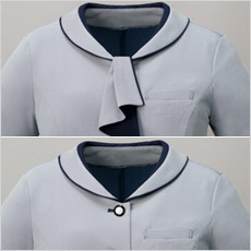配色トリミングが顔周りをすっきり美しく見せます。共布フリルをつけるとボウタイ風に。