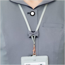 ネームホルダーのストラップを通してボタンにとめて使う、ホルダーループ付き。表側はかわいいリボン型でアクセントにも。