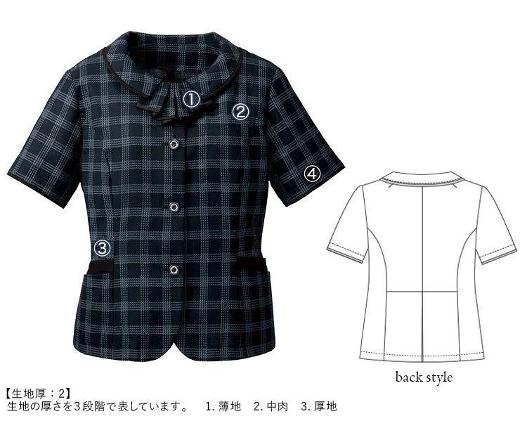 - 左胸ポケット(二重構造、胸のポケットのインク染み出し防止生地使用)、両腰ポケット、右腰印鑑ポケット、肩パッドなし、取り外し可能なフリル付き、後ろボックスプリーツ、生地厚2