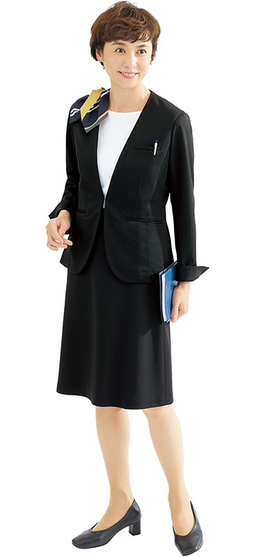 カーディガン感覚で羽織れるノーカラージャケットは、年齢や体型にオール対応するニット素材。軽くてストレッチ性があり、抗ウイルスと抗菌防臭で衛生対策もバッチリ。