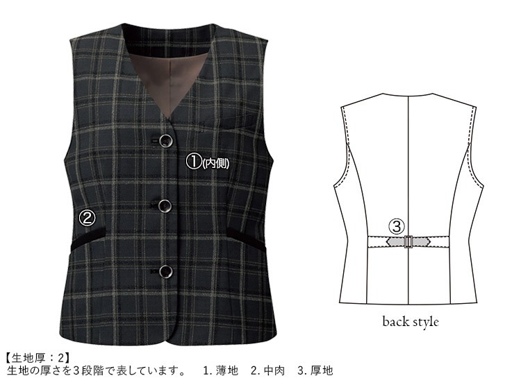 色を重ねた深みのあるレイヤーチェックがシックで柔らかな印象のベストは「抗ウイルス×抗菌防臭加工」付きの生地なので安心。シンプルな3つボタンのデザインで、幅広い職種・年齢・体型の方に着用していただけます。