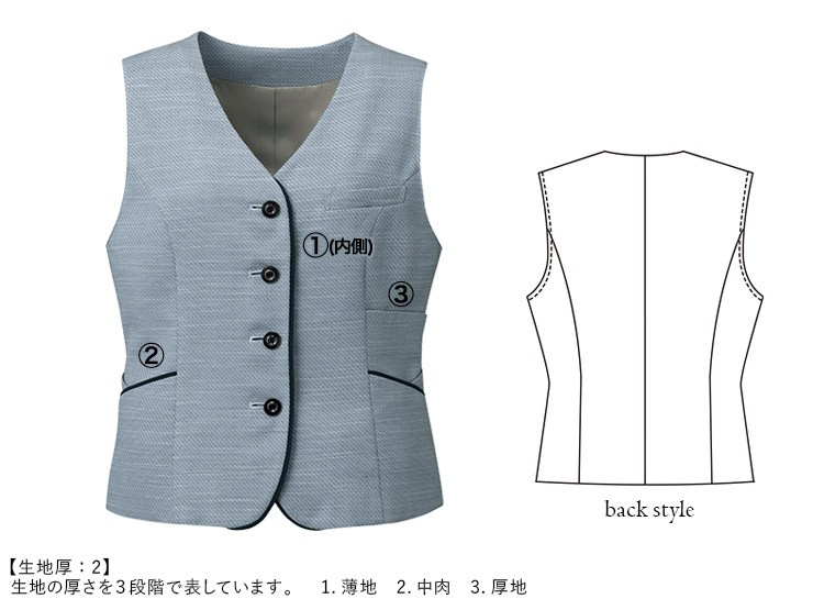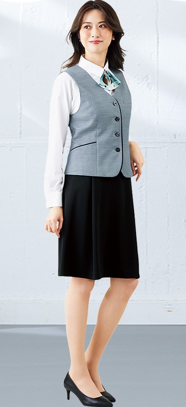 シンプルながらポケットのトリミングと凸凹感のあるツイード調の素材が印象的なベストは、ネップの素材感で清涼感のある印象に。シンプルなデザインとベーシックなカラーで幅広い職種や年齢の方が着用可能です。