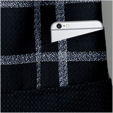 スマホがすっぽり入る深さのポケットは、体に沿う位置に付いているので、もたつきもなく快適。