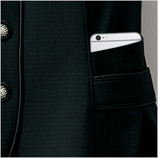 スマホがすっぽり入る深さのポケットは、体に沿う位置に付いているので、もたつきもなく快適。