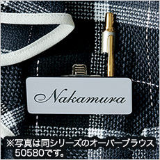 ポケットの型崩れ防止+ペンが沢山挿せる様、胸ポケットの外側に名札を簡単に差し込めるネームホルダーが付いています。
