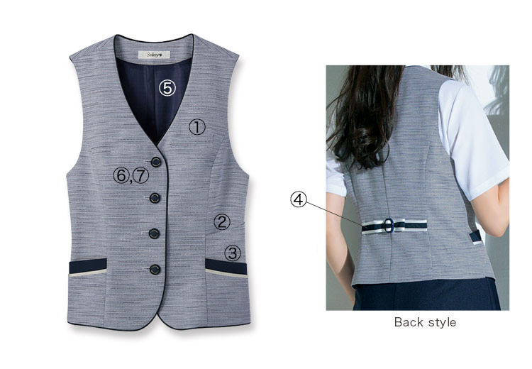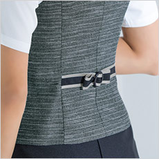 白のパイピングが爽やかなアクセントの背ベルト付きで、キレイな後ろ姿をキープ。
