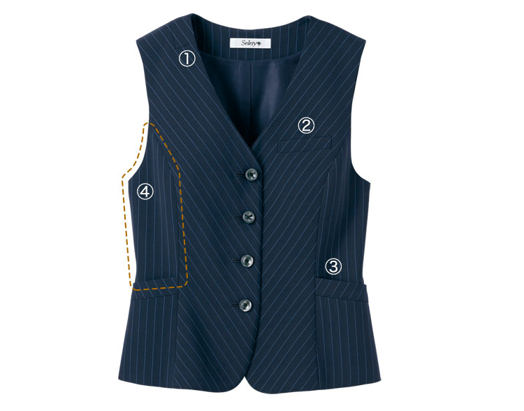 - 背抜き仕立て、胸ポケット、両腰ポケット、アクセサリーホール、制電ニット裏地使用、スタイルアップシルエット