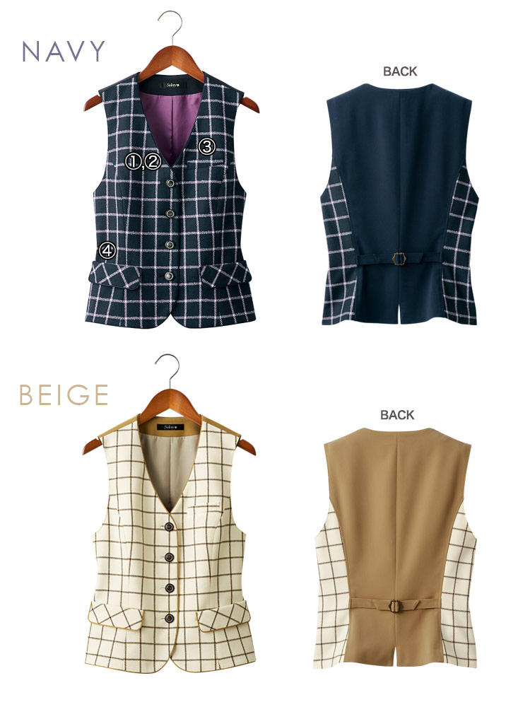 様々なシーンに映える、チェック柄のベスト。制菌・抗ウィルス加工で、いつでも清潔を保ちます。また防汚加工で白でも安心です。