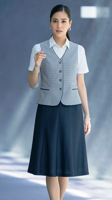 パイピングがアクセントの涼やかなベスト。後ろペプラムが後ろ姿も可愛く演出。