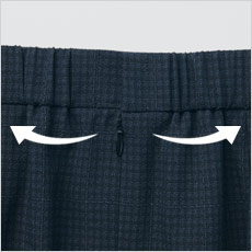 - 制電裏地使用、スタイルアップシルエット、右腰ポケット、後ウエストゴム、後ベンツ