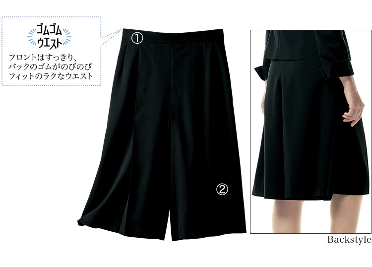 高級感のあるブラックのキュロットは、ウエストゴムでストレスフリー。それぞれのサイズにマッチしたパターン採用でどんな体型の女性も美しく。ホームクリーニングOKなのも嬉しい。