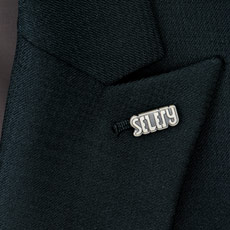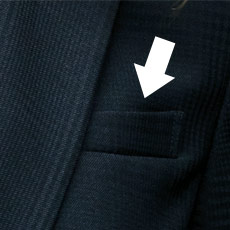 インナーの形を選ばないピークドラペル。左襟のフラワーホールは、社章などのバッジを留めるポイントに。