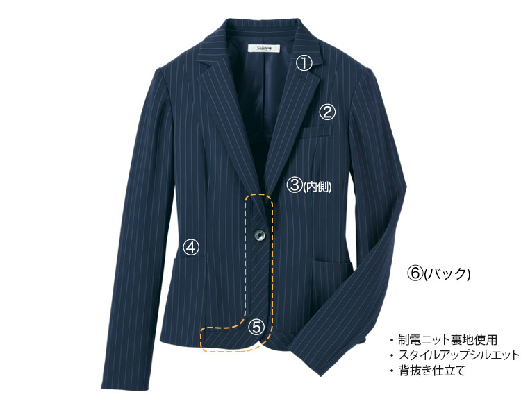 - 背抜き仕立て、内ポケット、胸ポケット、両腰ポケット、フラワーホール、制電ニット裏地使用、スタイルアップシルエット