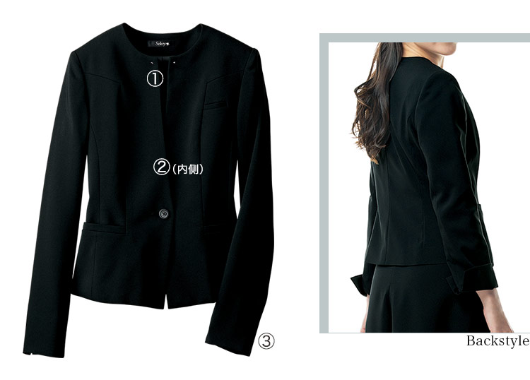 - 左側胸ポケット、左側内ポケット、両腰ポケット、スタイルアップシルエット、スワロフスキー®・クリスタルデザイン