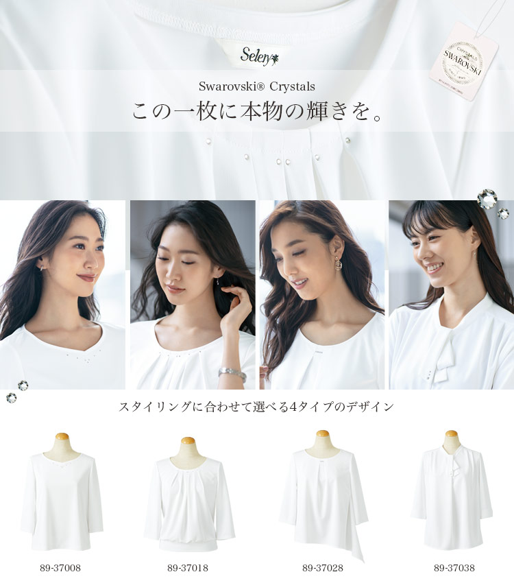 きちんと感と女性らしさをプラスしたスワロフスキー・クリスタルが煌めくカットソー。
