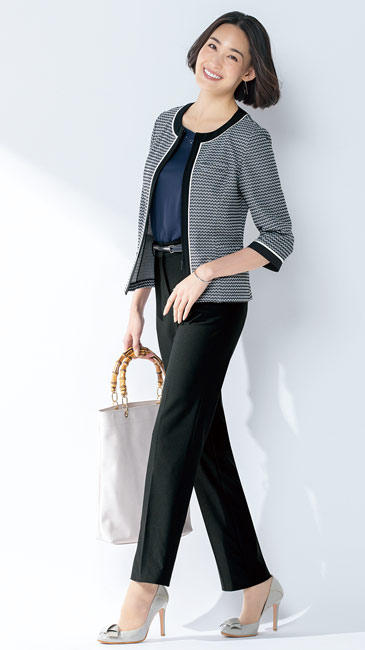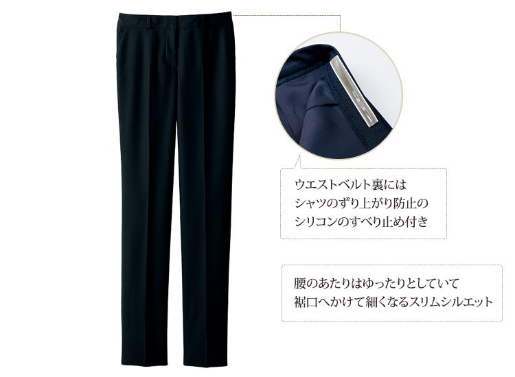 - 制電・ストレッチ裏地仕様、両腰ポケット、すべり止め、ベルト通しあり、スリムシルエット、ジャストウエスト