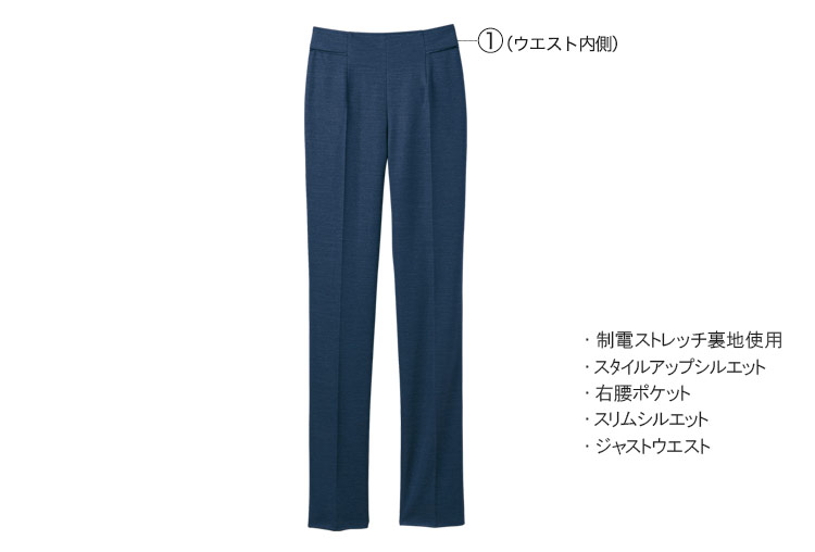- 制電・ストレッチ裏地使用、スタイルアップシルエット、右腰ポケット、すべり止め、スリムシルエット、ジャストウエスト