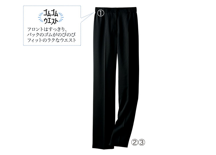 高級感のあるブラックのパンツは、ウエストゴムでストレスフリー。それぞれのサイズにマッチしたパターン採用でどんな体型の女性も美しく。ホームクリーニングOKなのも嬉しい。