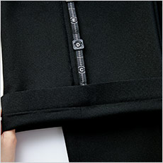 パンツの裾にメモリ付きのアジャスターテープとスナップボタン付きだから、自分で簡単に裾上げできる。