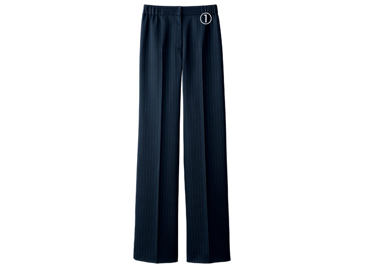 - スタイルアップシルエット、両腰ポケット、ウエストゴム、ストレート、ジャストウエスト